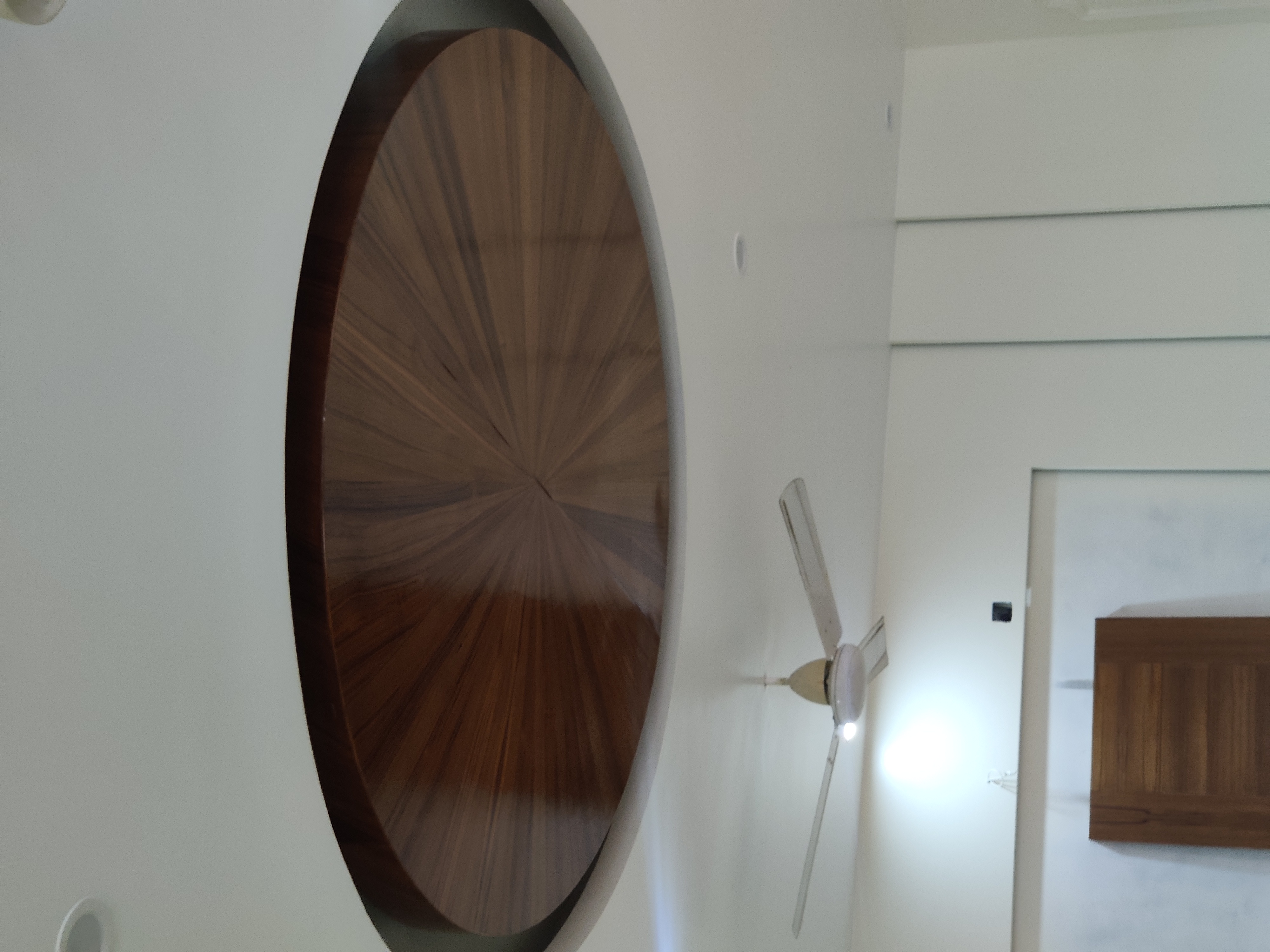 Round Shape wooden design element created in ceiling having frame/hdhmr and vinear on it and poli